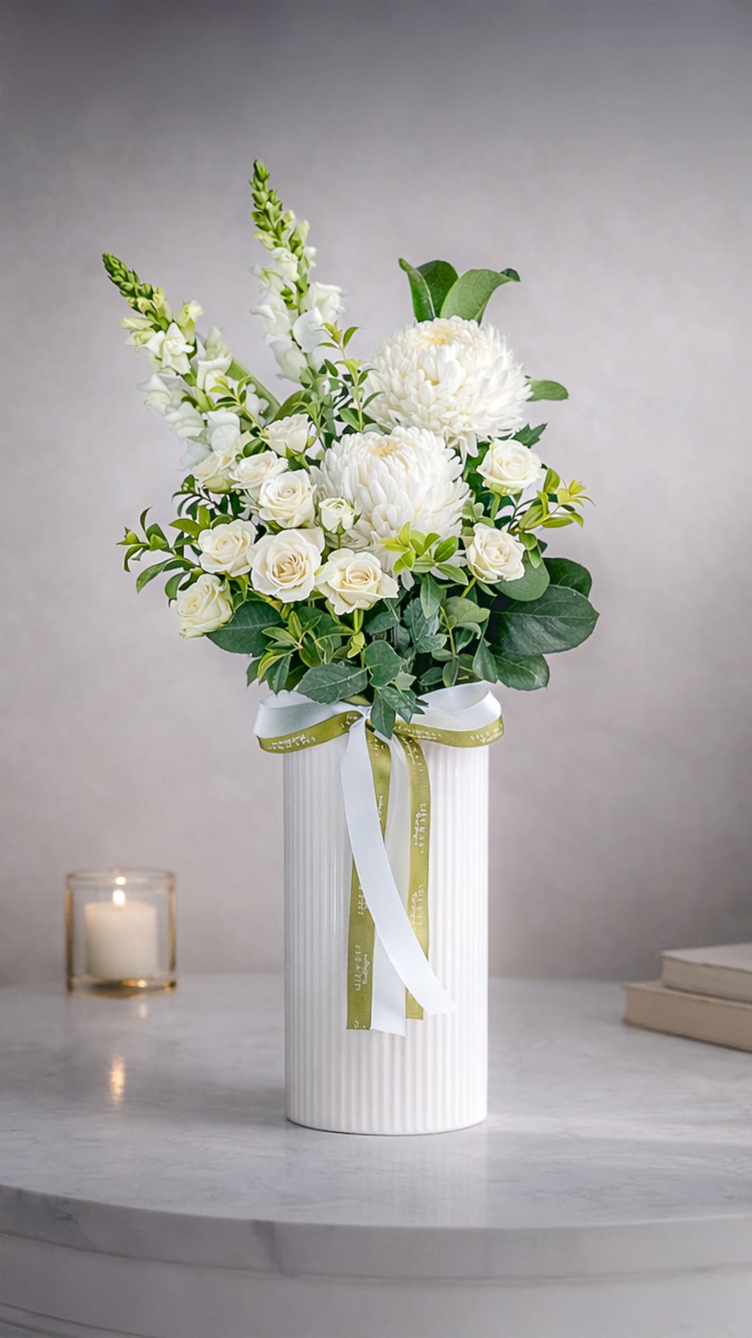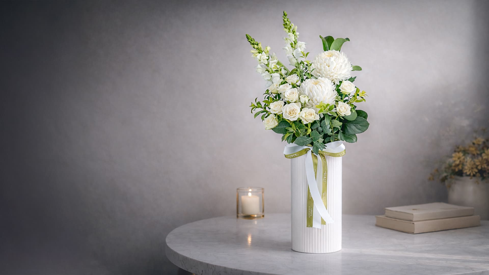 A timeless arrangement of seasonal blooms styled in our signature ceramic vessel. Elegant, refined, and designed to suit any space or occasion. Available in classic white and green, pastels, or bright colour palettes.