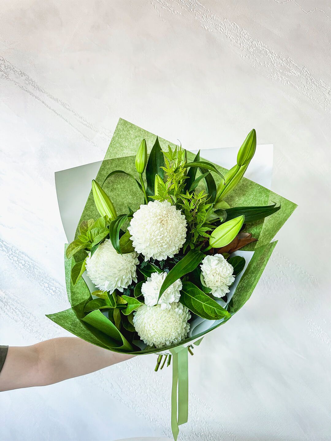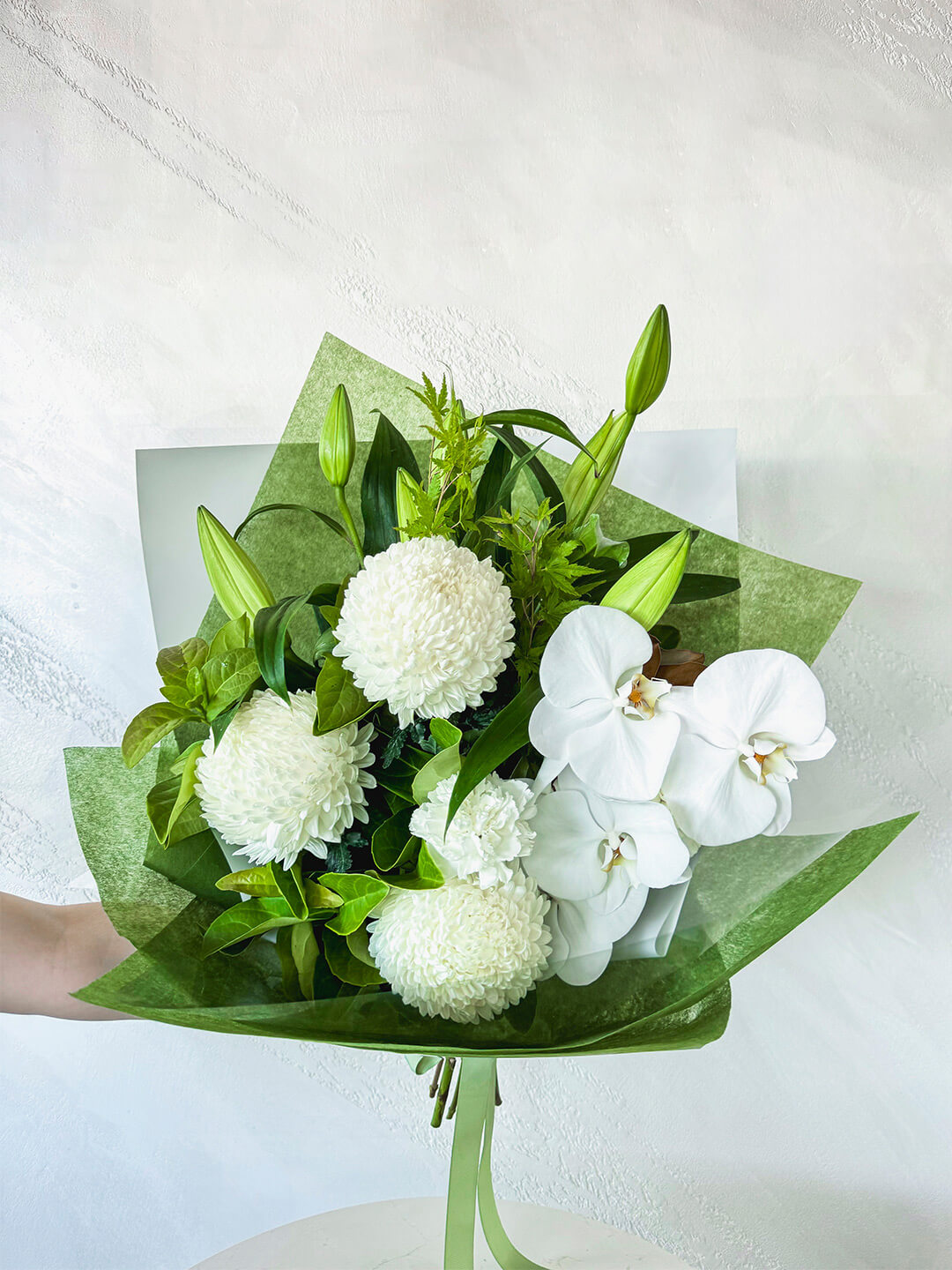 Crisp and fresh, this bouquet is designed with oriental lilies, mums and carnations. Make it extra special with an upgrade to include a Phalaenopsis orchid.